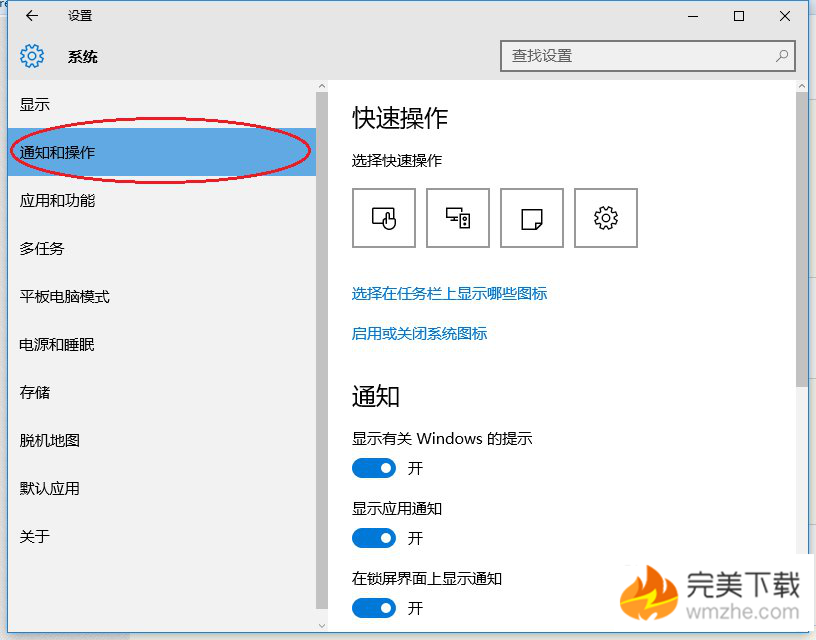 2、点击自定义后,点击通知与操作