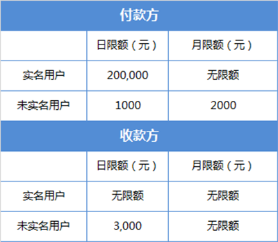 注:付款方未实名用户的日限额与月限额消费是包括微信支付所有的消费额度。如发红包已支付使用日限额1000,那么当日限额已全部使用完,无法再进行其它支付消费,比如转账等。