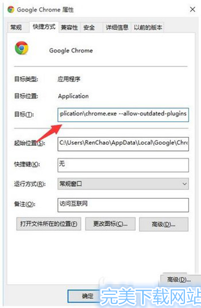 这个方法是在谷歌浏览器Chrome的快捷方式上点击鼠标右键,选择“属性”,在“快捷方式”选项中的目标那一栏的最后面增加一个参数:--allow-outdated-plugins (注意--allow-outdated-plugins之前有一个空格),然后点击确定,这样谷歌浏览器Chrome就不会再有这样的错误提示了。