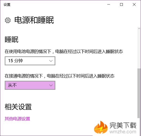 7、按下开始菜单,输入“电源”弹出设置界面,下拉找到“睡眠”,选择“从不”即可(接通电池的情况下还是默认不改为好)。