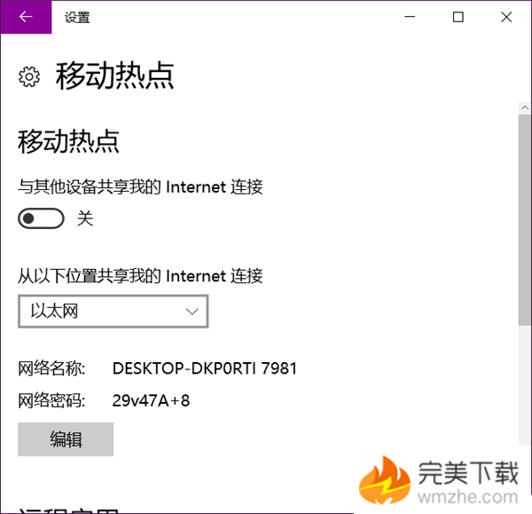 3、先点击“编辑”修改热点的网络名称和网络密码,修改完毕保存后,回到这个界面,点击“与其他设备共享我的Internet连接”下的滑动开关至“开”。