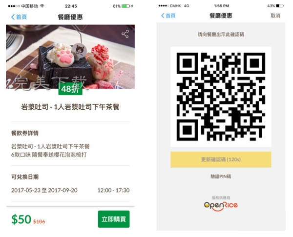 餐饮优惠引入的是香港的“大众点评”OpenRice的吃喝玩乐优惠,在支付宝里购物后,到店扫码核销。