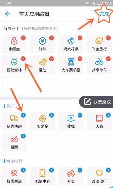 第三步,发现每个应用右上方都有出现“+”、“-”标记,很显然“+”就是添加,“-”就是删除,选择常用的应用,删去不常用的应用,之后点击右上角“完成”即可。