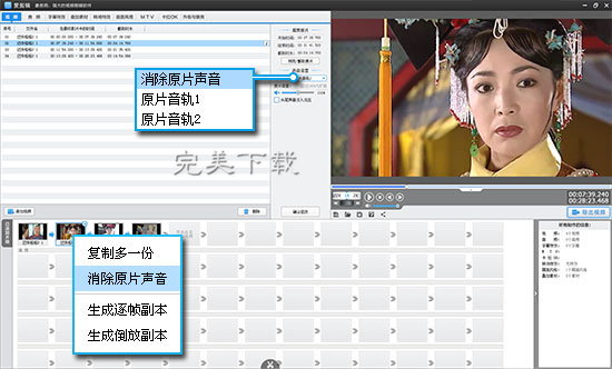 视频剪辑好后,先在“视频”选项卡中,把要配音的片段消除原音。只要在视频列表右侧,把“使用音轨”选择为“消除原片声音”即可。或者直接在“已添加片段”列表,选中视频片段缩略图,单击鼠标右键,在弹出菜单中选择“消除原片声音”。