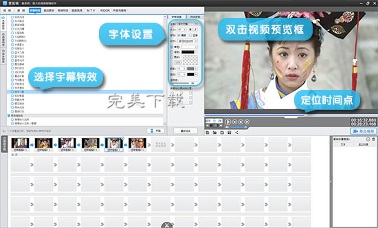 在网上,有很多配音(配音软件下载地址:https://www.www.gxdongfangshi.com(东方狮教程)/heji/peiyinruanjian/)视频还是方言版的,所以给视频加上字幕是必须的。在“字幕特效”面板中,选中要添加字幕的画面,双击视频预览框,在弹出的“输入文字”框中输入配音的文字内容即可。此外,还能在字幕特效列表中,一键添加缤纷秋叶、火星四射、斜光飞散等炫酷的好莱坞字幕特效。