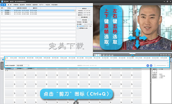 视频导入之后,在“视频”选项卡的视频预览框中,选择要截取的画面,点击主界面下的“剪刀”图标(Ctrl+Q),一键快速分割视频,截取出我们需要的片段。(PS:要精确踩点的话,可以用键盘的上下左右方向键,左右是5秒,上下是逐帧;或者“Ctrl+E”启用时间轴,同样可以精确踩点。)