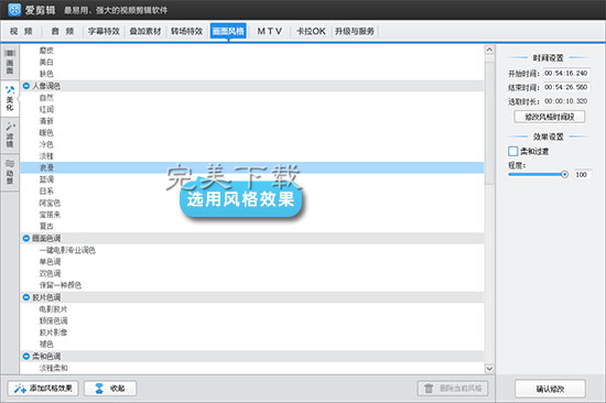 切换到“画面风格”面板,我们还能给配音的视频一键调色,为视频中的人物一键美颜,以及磨皮和美白,提高视频颜值,让我们的配音视频做到与众不同,更有观赏性。
