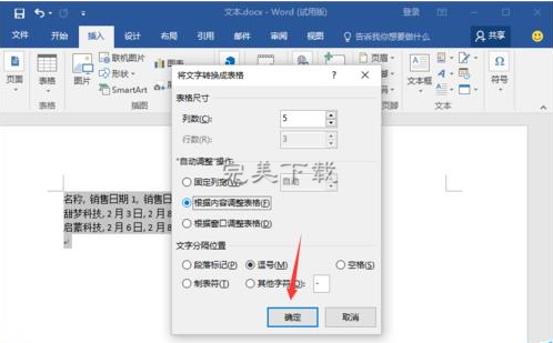 6、在“将文字转换成表格”对话框中,选择“自动调整操作”中的“根据内容调整表格”,而后点击“确定”按钮。如图所示