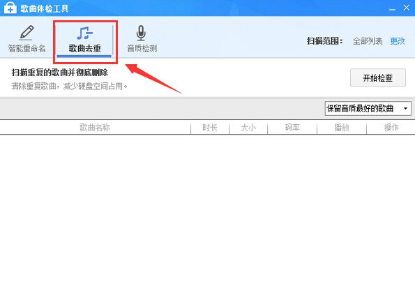 在本地列表空白处,点击右键,右键菜单中点击“歌曲体检工具”,即可使用歌曲去重功能。