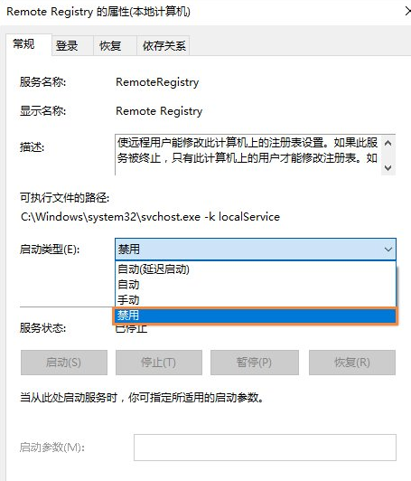 3、双击打开Remote Registry服务的属性,将其启动类型设置为“禁用”,然后点击确定退出即可。