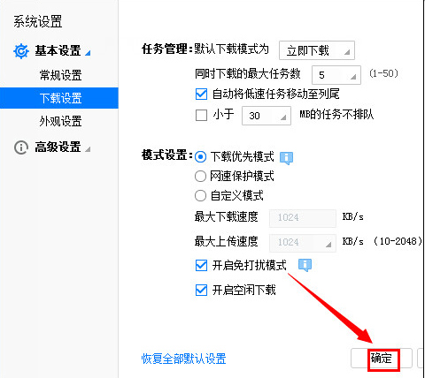 3、在下载设置右侧找到“开启免打扰模式”,将其勾选然后点击“确定”即可。