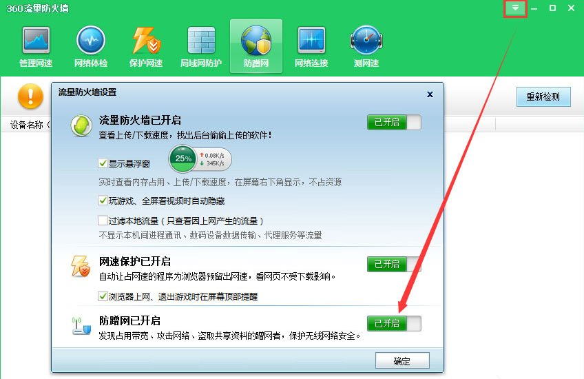 2、此时会跳出360流量防火墙,我们点击“防蹭网”;