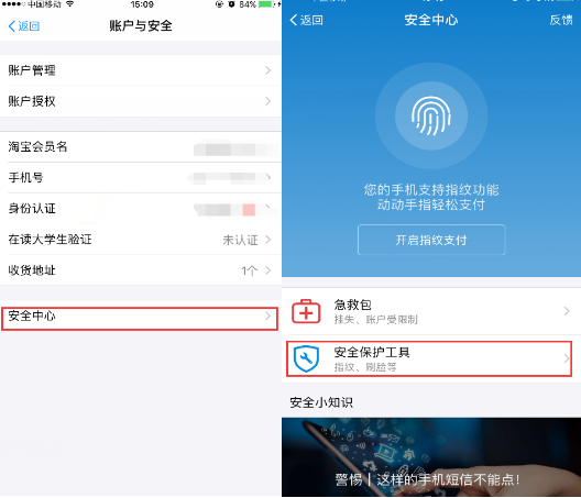 2、在“账户与安全”页面打开“安全中心”,选择“安全保护工具”;