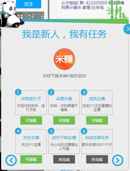 如果你是刚刚注册的熊猫TV的话,你还可以点击右侧的任务列表,完成里面的任务,你可以拿到将近一千的竹子哦,按照任务顺序,一个一个去完成吧。