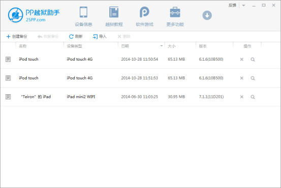 1、在越狱前请确认您已经备份设备资料,您可以通过PP越狱助手、PP助手电脑版(For iOS)或者iTunes进行备份。