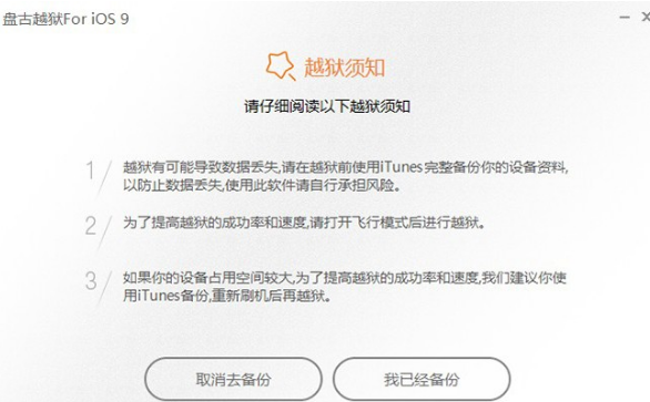 5、请仔细阅读【越狱须知】后,点击【我已经备份】进入下一步
