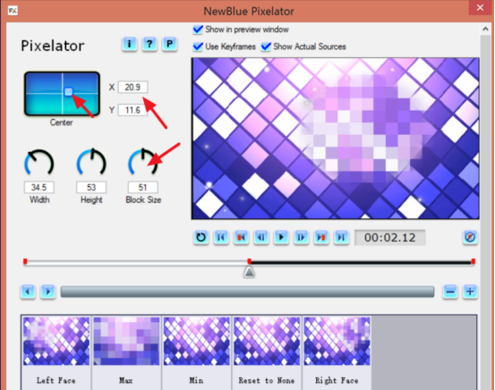 2、和上面一样双击选择自定义滤镜,弹出下面的窗口,可以设置位置、赛克的大小,
