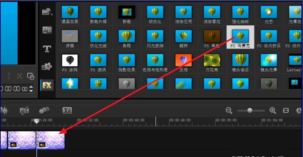 2、将视频要打马赛克的地方进行剪辑,找到【FX】下的【fx 马赛克】,将它拖动到视频上,