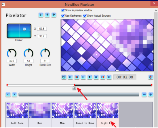 3、如果要打马赛克的物体活动范围比较大,例如从左边移动到右边,先选择左边left face,在移动位置时间上点击right face,上面会出现一个红点,这样马赛克就会从左边移动到右边了,