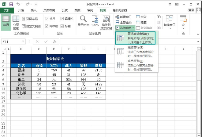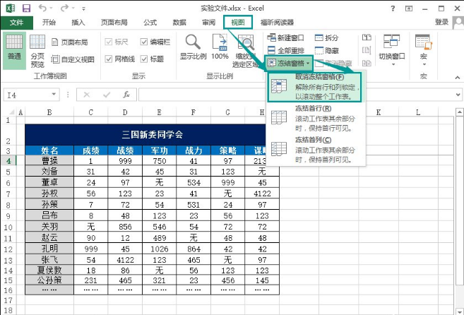 8、如果我们想把这些设置取消,同样在菜单栏点击“视图”,然后是“冻结窗格”→“取消冻结窗格”,这样刚才的设置就取消了。