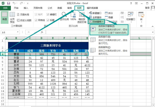 2、鼠标点击先选中第四行,在菜单栏点击“视图”→“冻结窗格”→“冻结拆分窗格”。