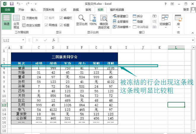 6、冻结窗口后,鼠标向下滚动,箭头所指直线以上的单元格就固定不动了。
