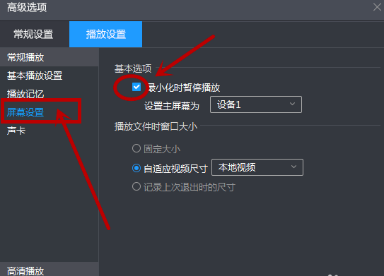 4、然后点击“屏幕设置”,在“最小化时暂停播放”前面的方框里面打个勾,再应用、确认。