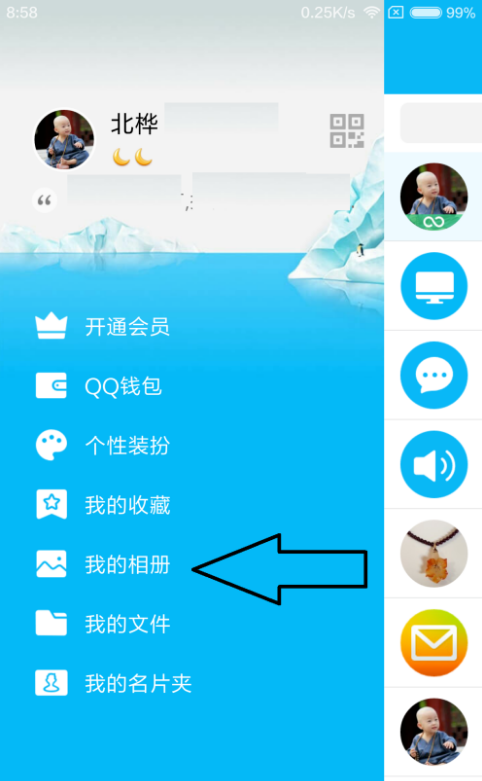 1、打开手机QQ,右划手机屏幕,切换到相册页面,