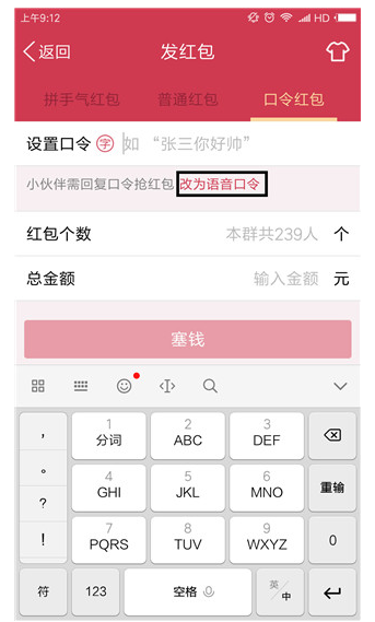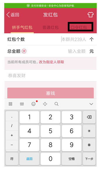 3、点击黑色框中的口令红包,转化为口令红包。