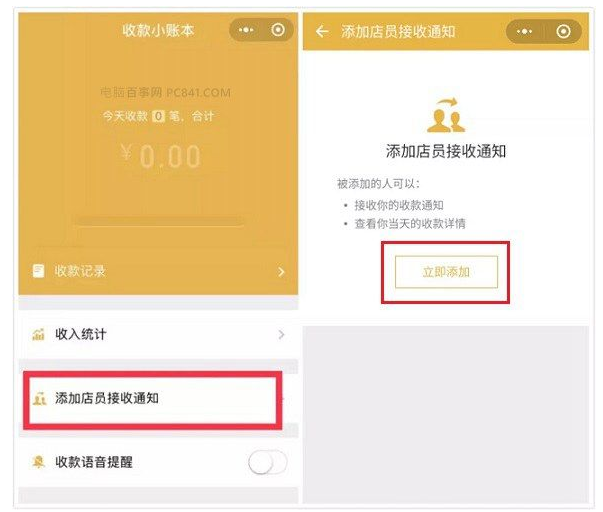 如果在“收款小账本”中没有看到官方收款码申请入口怎么办?不用灰心,只要假装是小老板,添加一个店员通知就可以了,如下图所示。