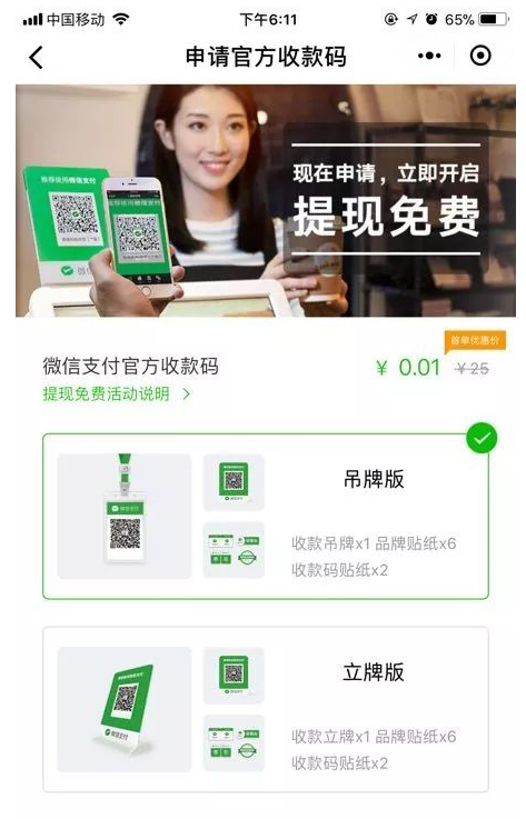 进入之后点击“申请官方收款码”,之后只要支付1分钱,然后选个你中意的立牌或吊牌实物,填好地址就行了。