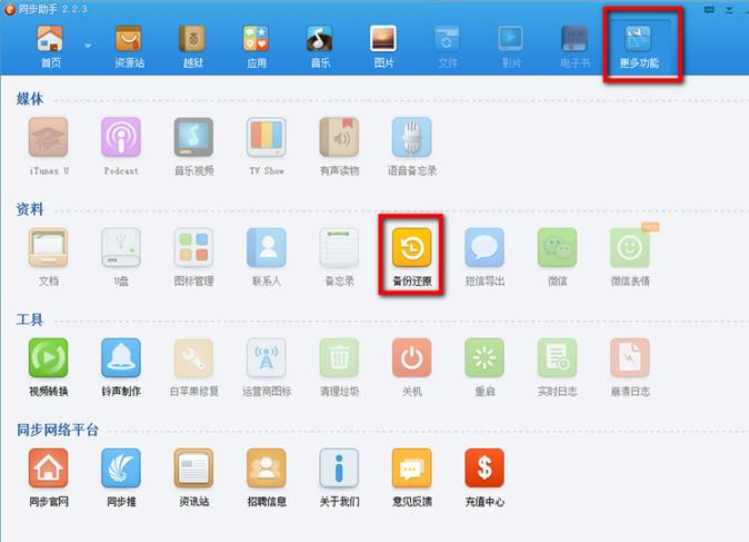 1.刷机和越狱前请注意做好数据备份,以便出现异常时能恢复数据。为保险起见,推荐使用iTunes和同步助手各备份一次。同步助手备份:运行同步助手切换到“更多功能>>备份还原”可创建新的备份。详细操作请参阅:如何备份重要数据