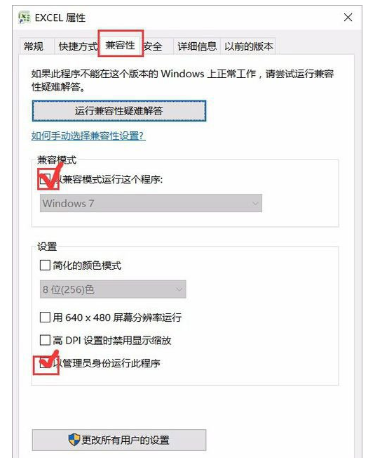 2、选择兼容模式那个栏目,勾选兼容模式,以管理员身份运行此程序,然后确定;