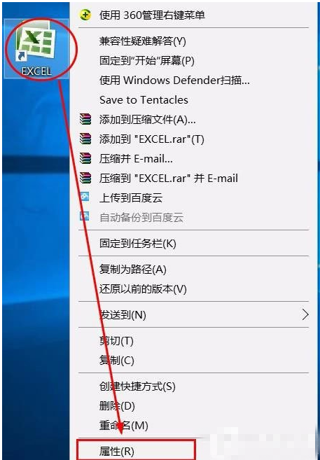 1、找到桌面Excel图标,右击,在菜单中选择属性;