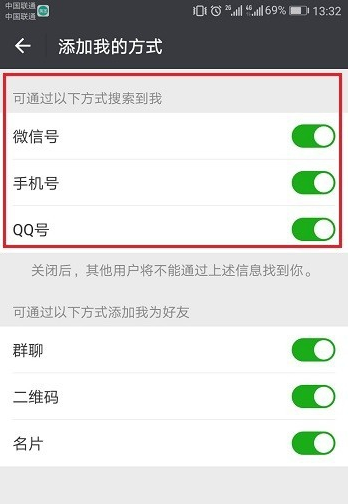 5、进去添加我的方式这一界面,可以看到三种方式全部关闭了,这就是搜不到账号的原因,如下图所示: