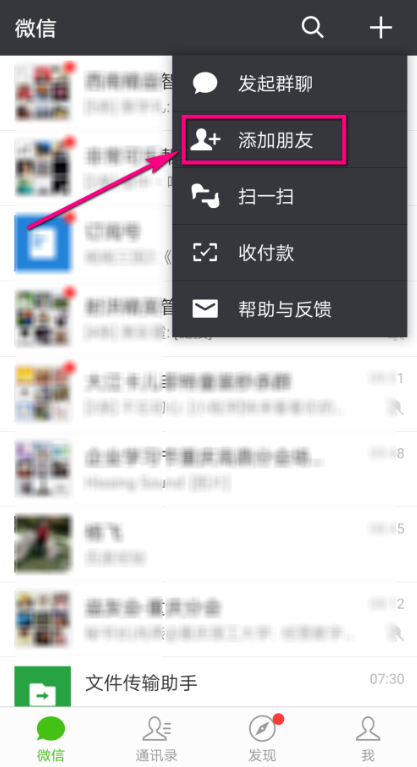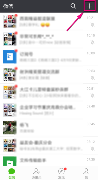打开手机微信,进入聊天信息页面,点击右上方的加号,如图所示。