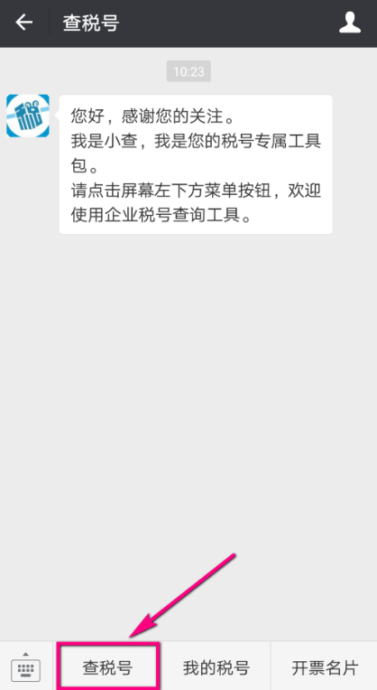 添加请关注该公众号,进入公众号聊天页面,在下方点击【查税号】按钮。