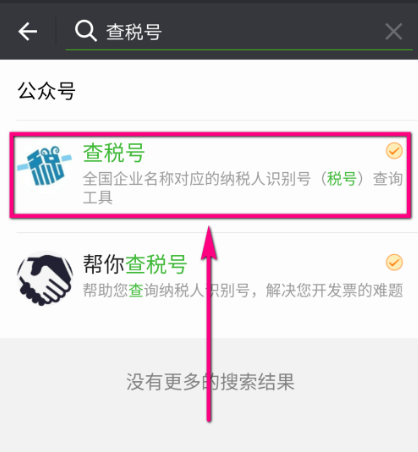 在该页面中输入“查税号”,点击【搜索】,点击如图所示的公众号。