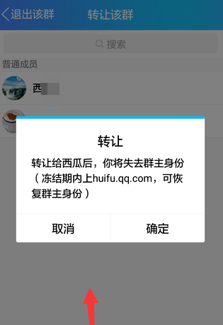 在跳出的转让条款中,选择确定转让,这样就将群组转让给了对方。如果在冻结期间内,想要要回群组,可以再次申请恢复群主身份。