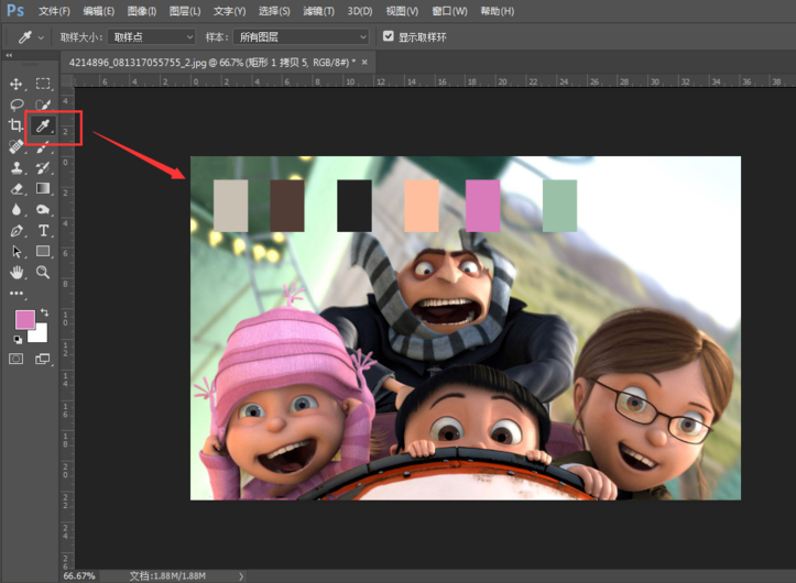 提取颜色最常用的方法就是吸管吸取,选择不同区域颜色提取不同的颜色。