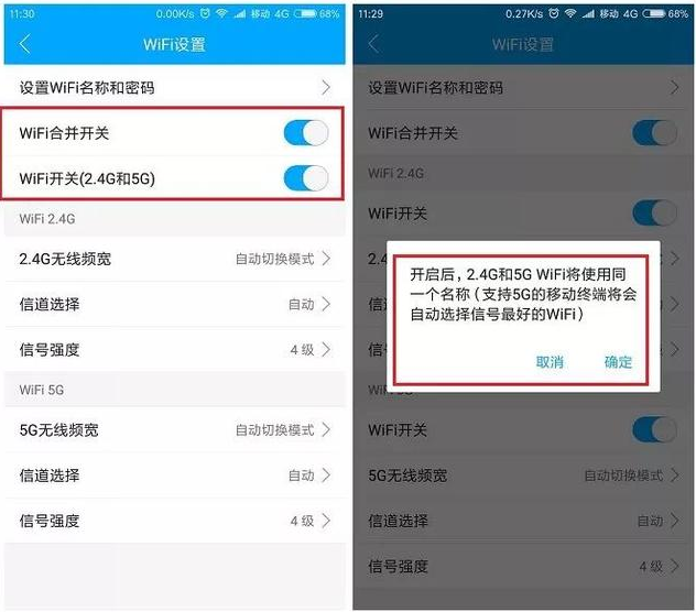 在电脑或者手机中登录路由器管理界面,在WiFi设置中将「WiFi合并开关」、开关开启即可,在弹出的对话框中点击“确定”,即可完成合并。