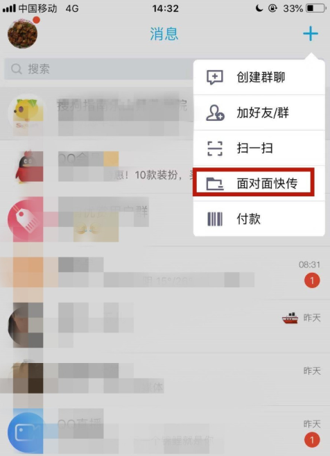 此时会弹出多个选项,我们点击“面对面快传”,如图,