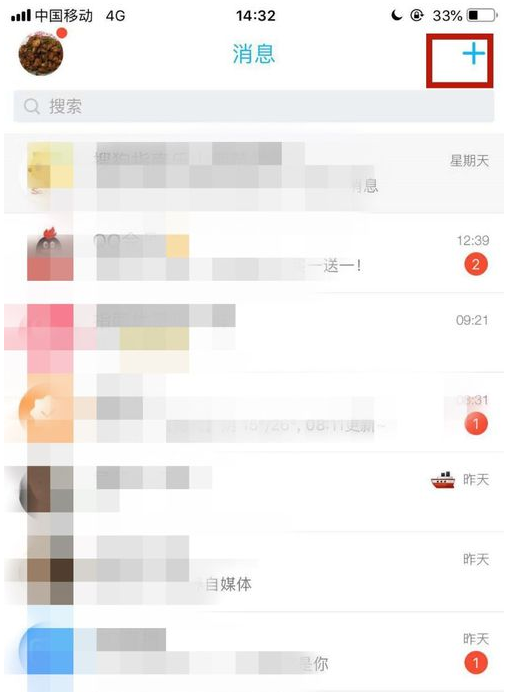 打开手机QQ,进入界面,点击屏幕右上角的+号,