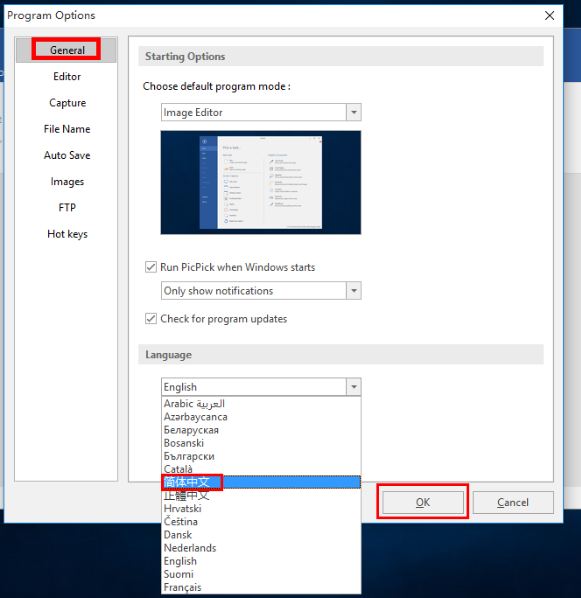 点击上方的【File】选项,弹出新页面,点击【Options】,在【Program Options】窗口中点击【General】选项,然后在右侧的的“Language”上选择“简体中文”即可。