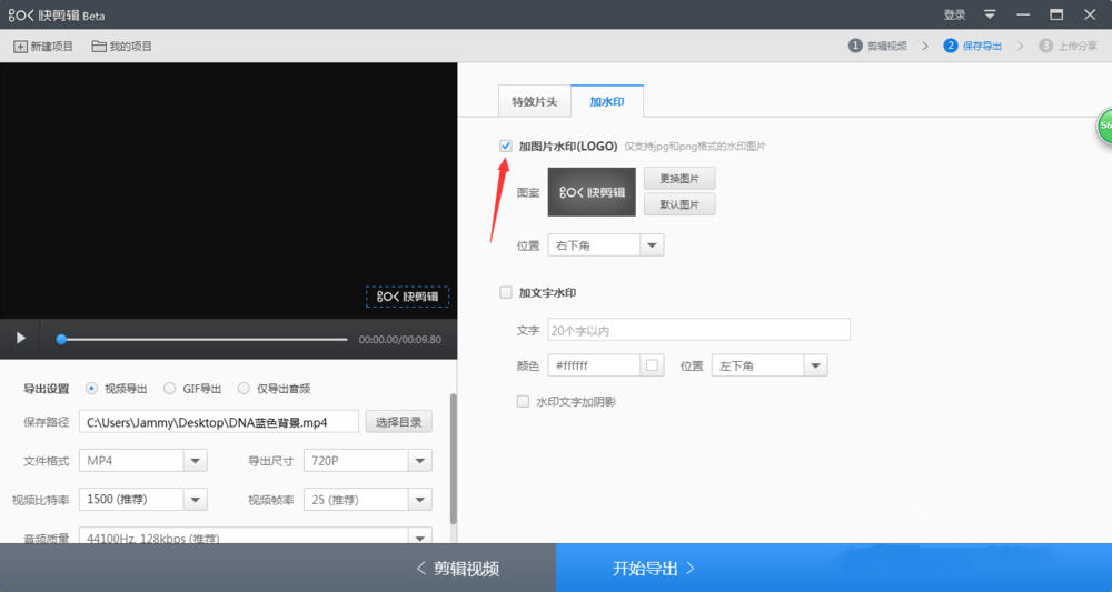 然后点击【加水印】,软件默认使用自带的快剪辑水印,取消勾选【加图片水印logo】,