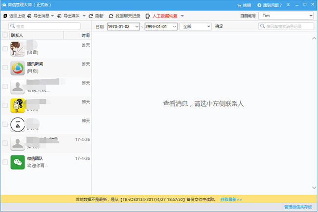 谨防文件资料丢失,iPhone用户可以借助iTunes来备份手机数据,当然了,如果你想查看iTunes备份文件,则需要借助专业软件。就以微信聊天记录为例,使用iTunes备份完成,我们可以通过微信管理大师进行查看。