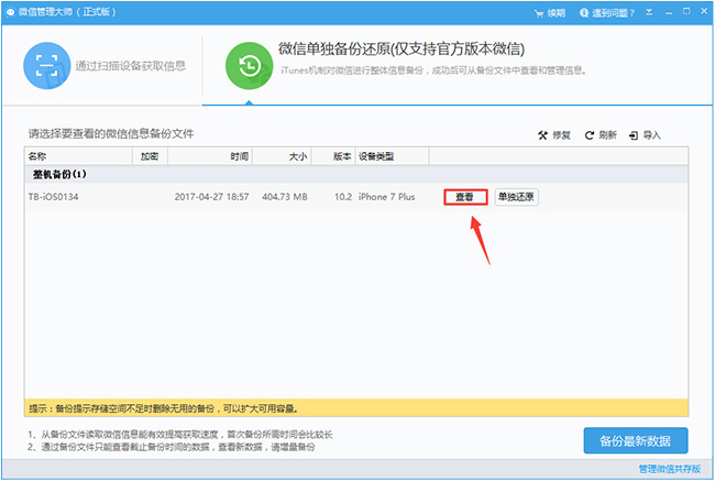 然后打开微信管理大师,进入界面,等待识别设备,点击【微信单独备份还原】——【查看】,