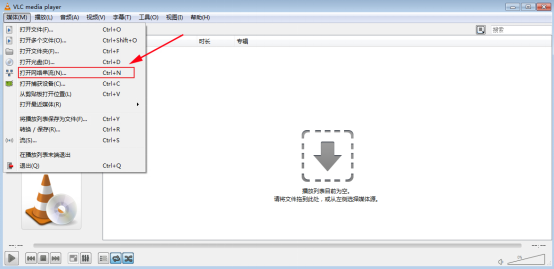 接下来开始进行vlc播放器投屏的具体操作。在vlc播放器主界面的菜单栏点击“媒体”,并点击其下拉菜单的“打开网络串流”选项。