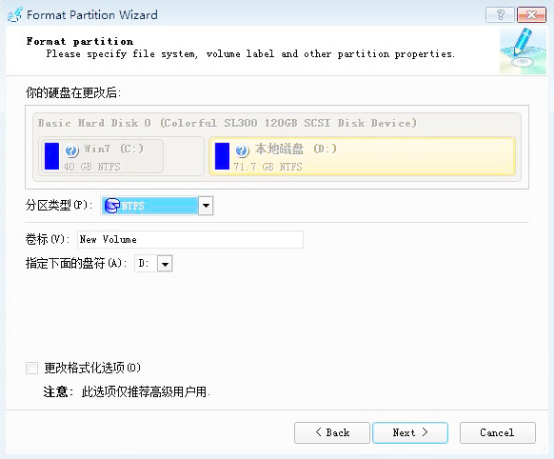 操作完上一步后,我们需要在对话框里设置分区格式化的分区类型、卷标、盘符。当然,也你也可以勾选“更改格式化选项”来对分区进行修改。不过值得注意的是,这个选项是仅仅推荐给高级的用户来使用的。所以,我们一般不用勾选“更改格式化选项”。