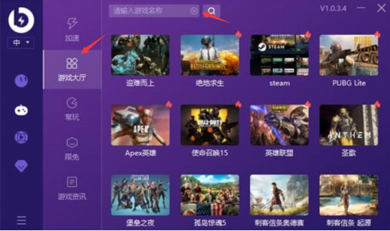 3、登录后,在薄荷加速器的界面中,点击“游戏大厅”的选项,便会在右方界面出现一系列的游戏,选择自己要加速的游戏。也可以在文本搜索框输入游戏名称进行快速检索。